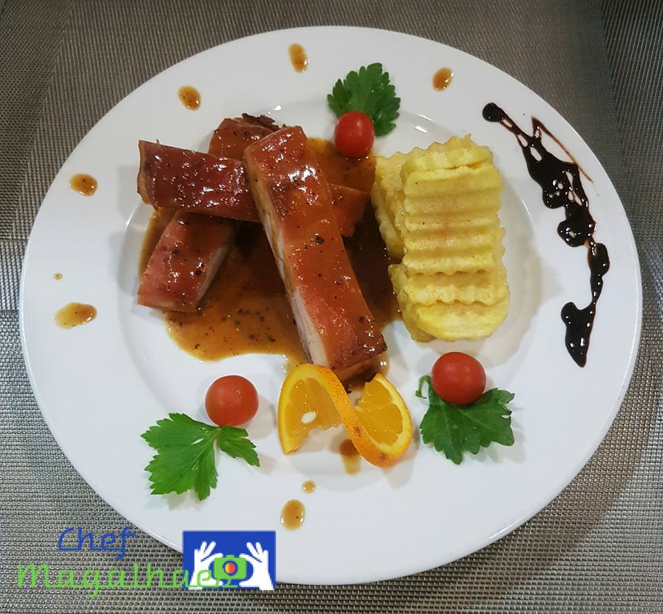 Sirva com batatas às rodelas fritas em azeite, salada de alface e rodelas de laranja.