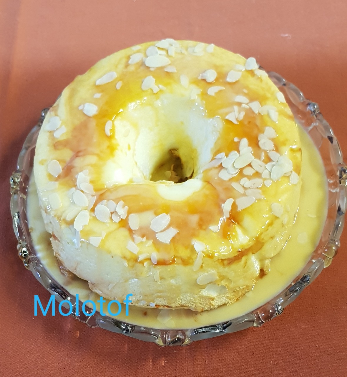 Leve ao lume um tacho com o restante açúcar, a água e as gemas, mexendo sempre até engrossar. Retire do lume, passe por um passador de rede e deixe arrefecer. Deite sobre o molotof e sirva fresco